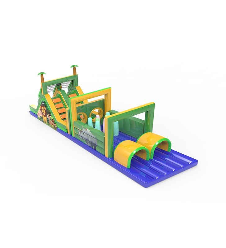 تتميز دورة العقبات القابلة للنفخ النابضة بالحياة هذه بموضوع غابة مرح مع زينة حيوانات مثل الأسود ووحيد القرن. مصممة لتحدي الأطفال البدني والمرح، وتشمل منحدرات تسلق وأنفاق وعقبات مختلفة في بيئة آمنة وجذابة.